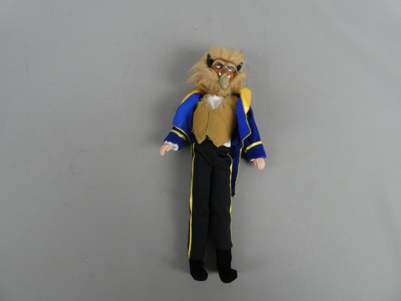 Het gezicht heeft een harige textuur met een duidelijke leeuwenmanen, hoorns en zichtbare slagtanden. De pop heeft blauwe ogen.