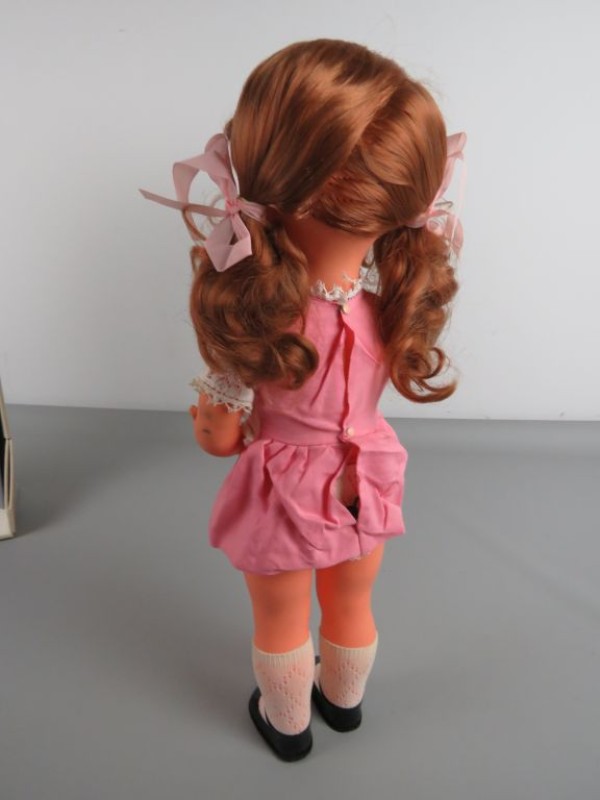 Hoofdpop (Titti) H 52 cm: De grotere pop, op de doos geïdentificeerd als Titti Mamma di Cialdino (Titti Moeder van Cialdino), heeft roodbruin haar in staartjes met roze linten. Ze heeft blauwe ogen en lijkt gemaakt te zijn van vinyl of een soortgelijk materiaal.