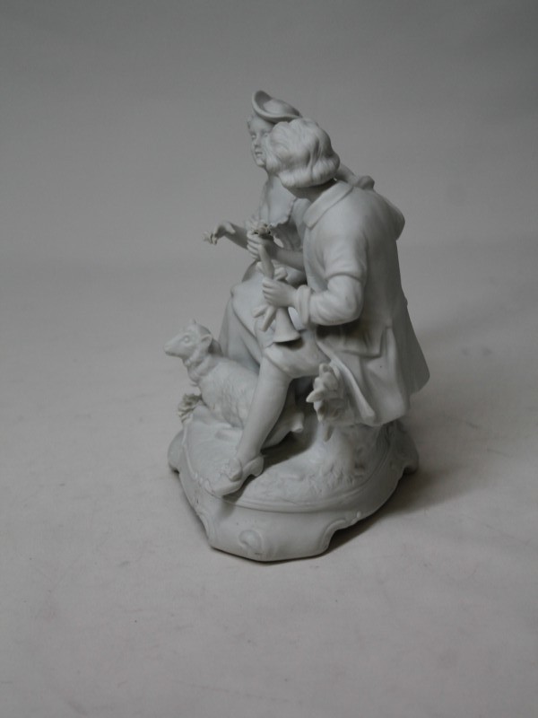 Een porseleinen sculptuur. Dit beeldje is een antiek biscuit porseleinen sculptuur van een romantisch koppel met een schaap, vervaardigd door Unter Weissbach in Duitsland.