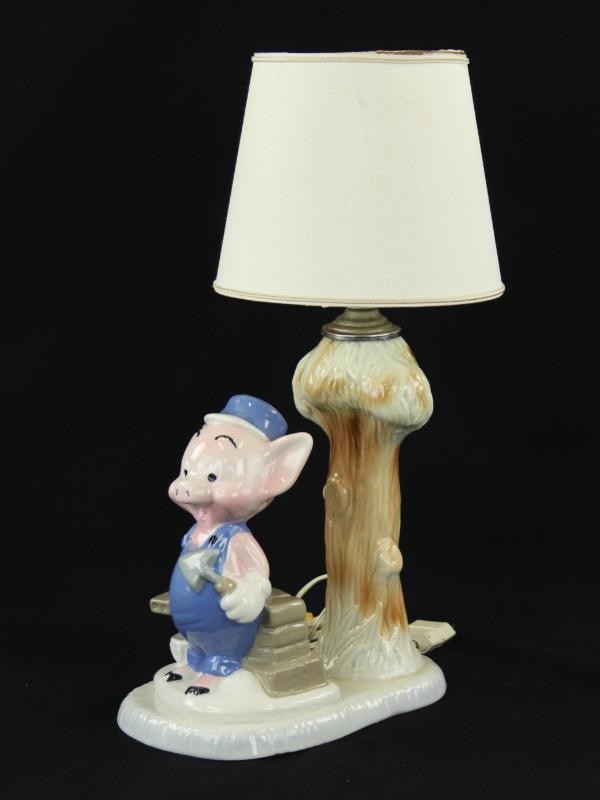 Breng een vleugje nostalgie en Disney-magie in huis met deze prachtige vintage tafellamp van Pales, versierd met een speels figuur van Knor (Practical Pig) in klassieke stijl.