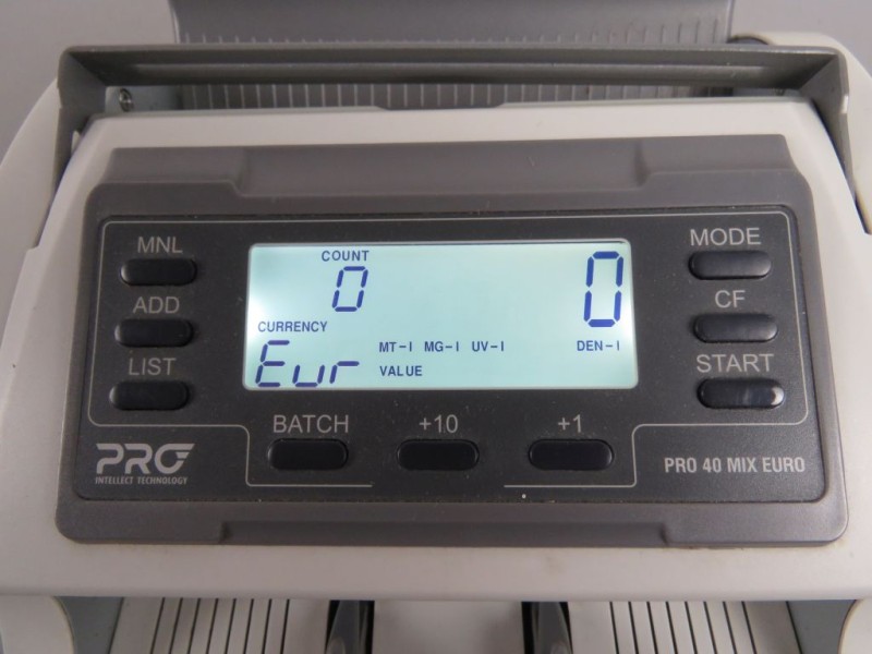 Deze PRO 40 MIX EURO is een professionele en compacte geldtelmachine, specifiek ontworpen voor het nauwkeurig tellen en controleren van Eurobiljetten. Het apparaat is uitgerust met een helder LCD-display en diverse functionele knoppen voor taken zoals het optellen van verschillende batches (ADD), het instellen van specifieke aantallen (BATCH) en het weergeven van gedetailleerde tellingen (LIST).
