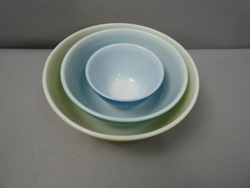 Dit zijn klassieke Pyrex Nesting Mixing Bowls (mengkommen) uit de populaire "Primary Colors"-serie.