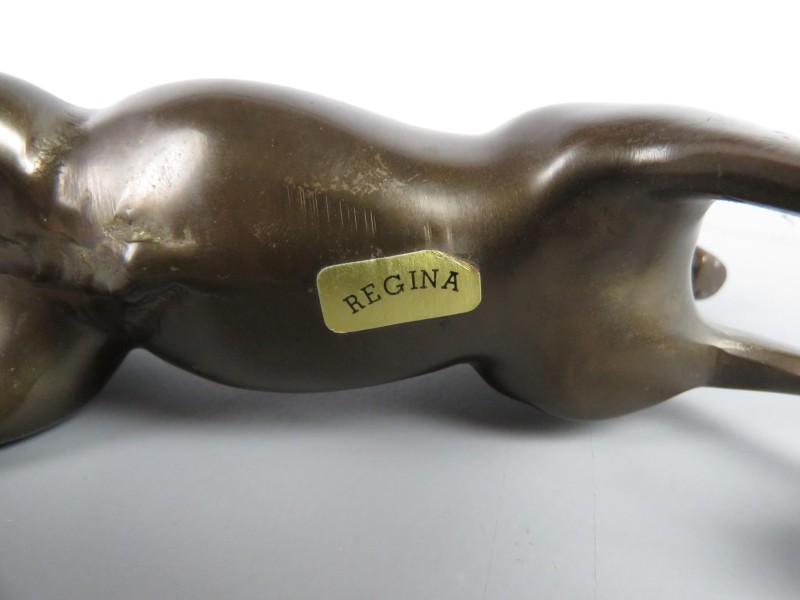 Metalen beeld van een paard. Gaten in de voet omdat het waarschijnlijk op een voet heeft gestaan. Gesigneerd Regina.
