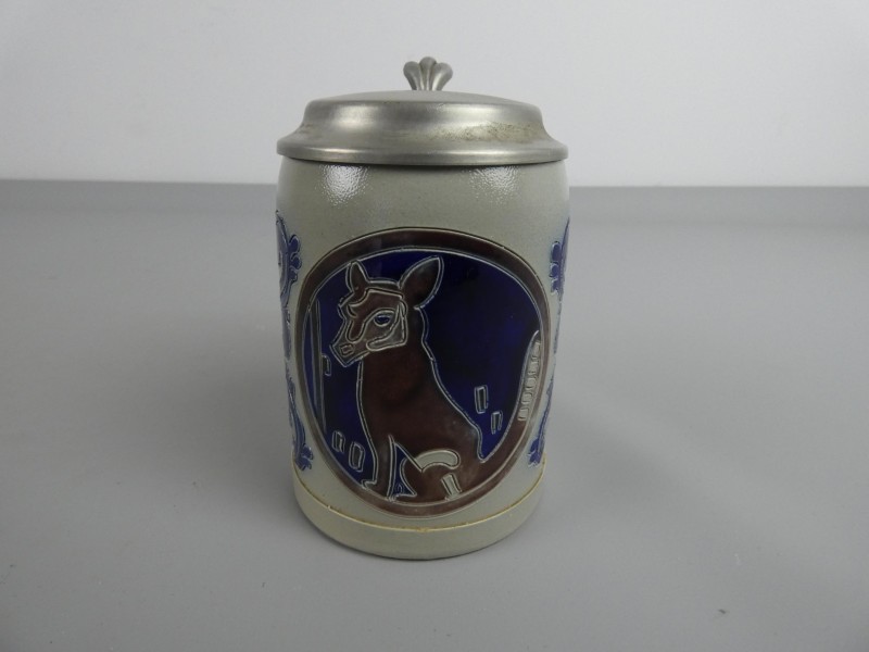 Materiaal & Techniek: De pul heeft een kenmerkende grijs-beige basis en is afgewerkt met Echte Salzglasur (echt zoutglazuur), een traditionele techniek die het oppervlak een unieke glans en textuur geeft. Dit glazuur maakt de pul bijzonder duurzaam.
