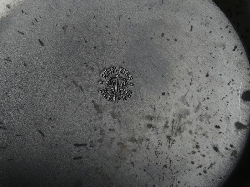 Deksel: De pul is afgesloten met een stevig tinnen deksel, gemerkt met het kwaliteitskeurmerk REIN ZINN BLEIFREI (Puur Tin Loodvrij), wat de aandacht voor detail en kwaliteit onderstreept.