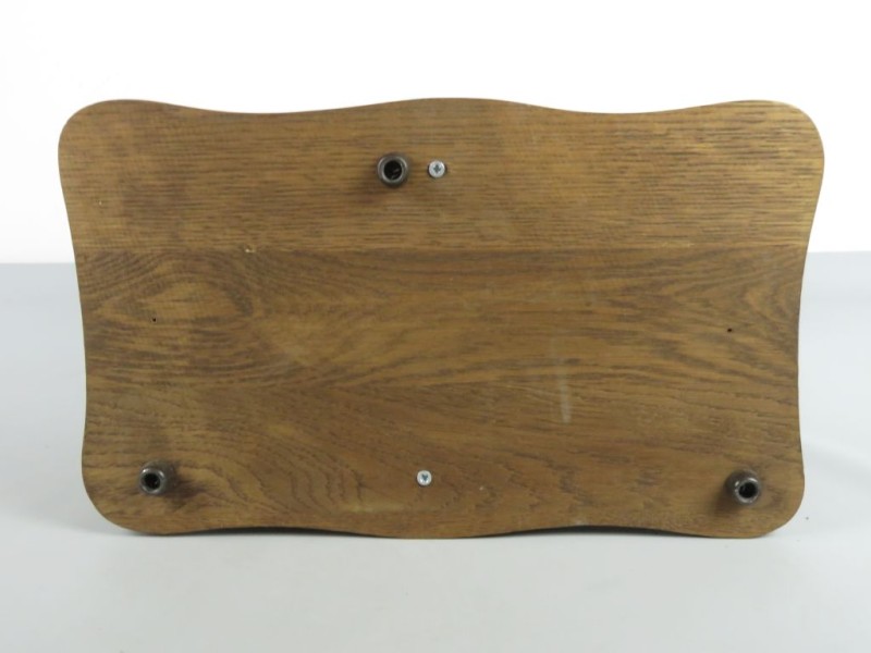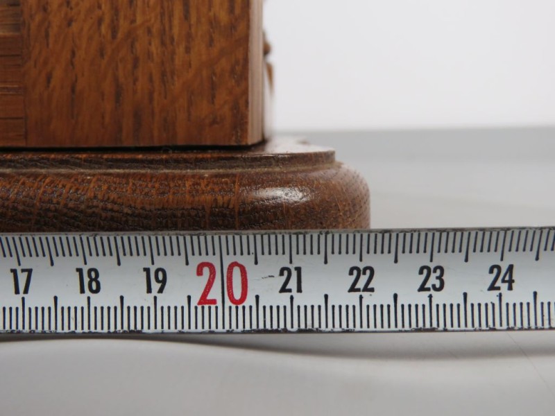 Onderzijde: De onderkant van de houten voet vertoont montagepunten (schroeven en gaten), wat suggereert dat het beeld vastgezet kan worden of onderdeel is van een groter geheel.