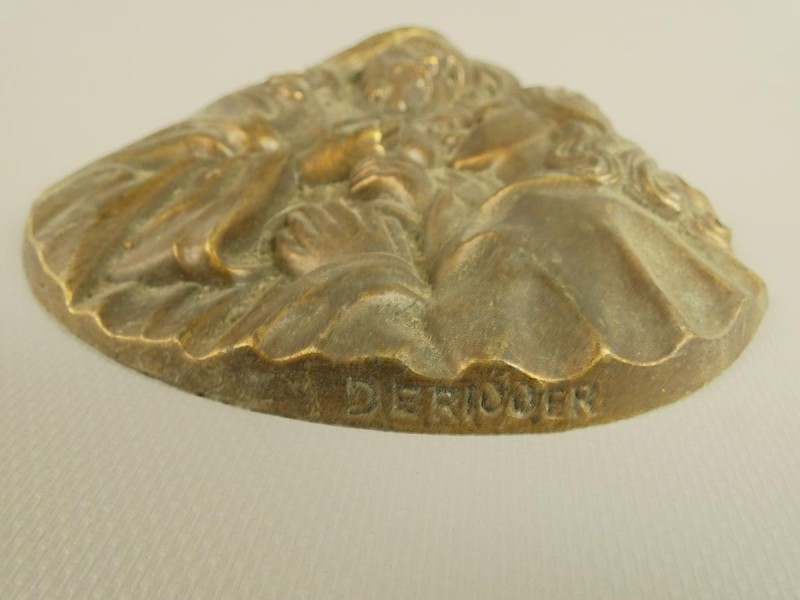 gedetailleerde antieke plaquette uitgevoerd in brons. Dit diep reliëf toont een ontroerende voorstelling van de katholieke devotie: de vereniging van het Heilig Hart van Jezus en het Heilig Hart van Maria. Onder aan de rand is de inscriptie "DE RIDDER" zichtbaar, wat wijst op de kunstenaar of gieterij. Gewicht: 0,42kg