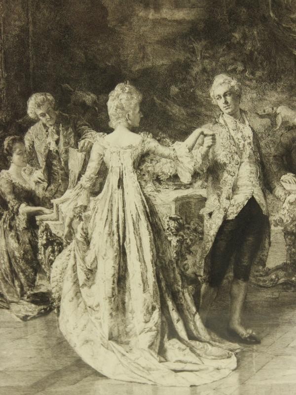 Reproductieprint 19e-eeuwse houtgravure “Menuet” naar Louis-Maurice Botet — plaatgesigneerd J.H. Rosier & potloodgesigneerd