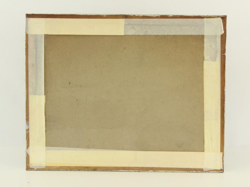 Staat: lichte verkleuring van het papier en een klein vlekje in een hoek; op de houten lijst is plaatselijk de zilverkleurige verf door ouderdom losgekomen; enkele minimale plekjes op het glas bij de hoeken. Deze sporen van gebruik belemmeren het beeld niet.