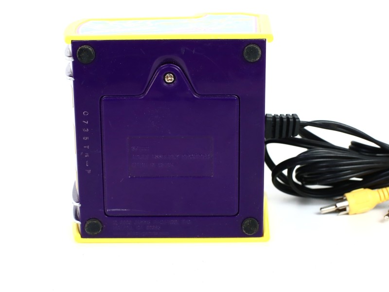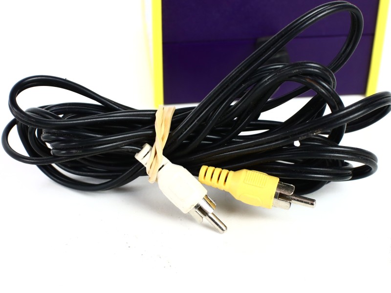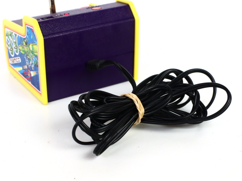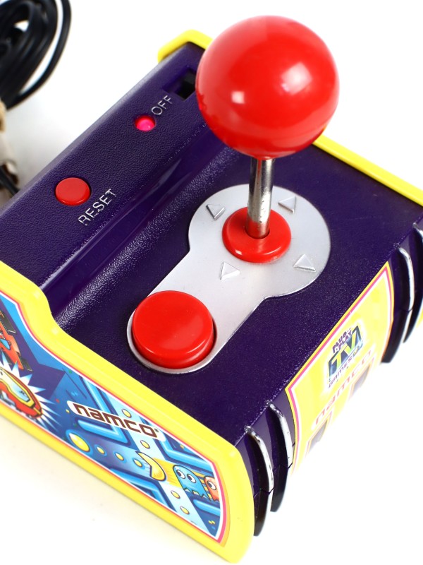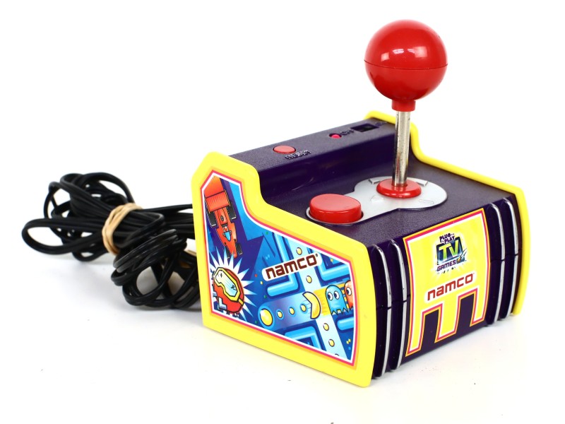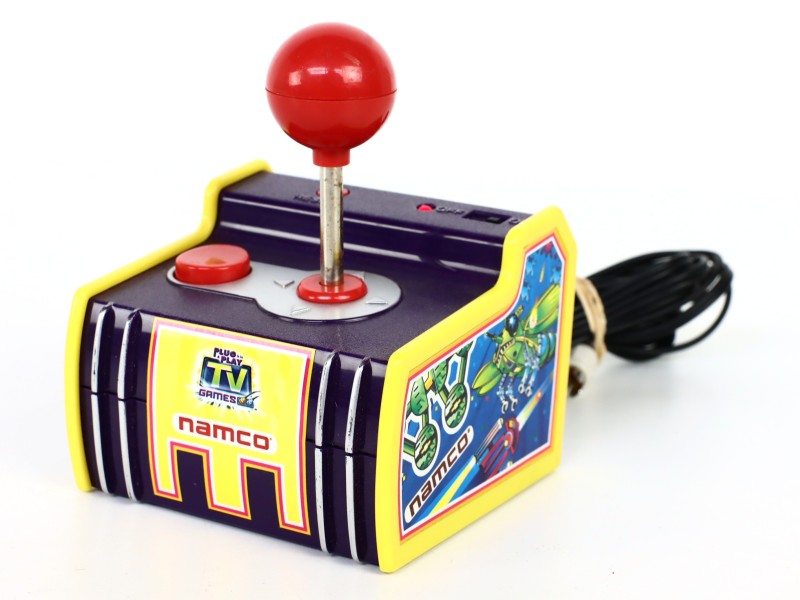 Een retro Namco “Plug ’n Play” TV Games-joystick van JAKKS Pacific (Malibu, CA) uit 2003. Dat is een op zichzelf staande joystick met batterijen (4× AA meegeleverd) die je rechtstreeks op de tv aansluit via composiet-AV (geel/wit). Geen console nodig—insteken, aanzetten en spelen.