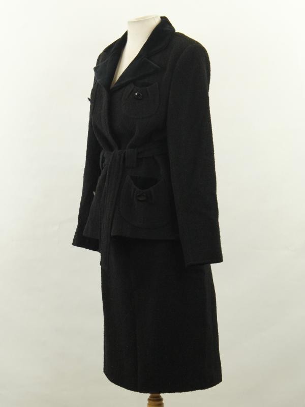 Verfijnd zwart mantelpakje van Richard Carrière Paris, bestaande uit een getailleerde mantel/jasje met ceintuur en een bijpassende rechte rok. Een tijdloos ensemble met een uitgesproken Franse couture-uitstraling, waarin sobere elegantie en rijke texturen mooi samenkomen.