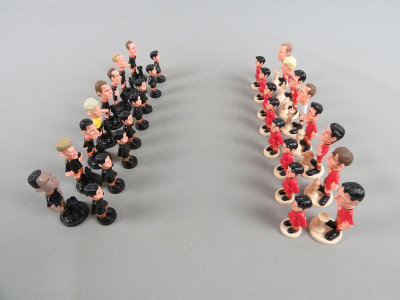Kunststoffen schaakstukken in thema van de rode duivels. Uitgegeven door Ariel.