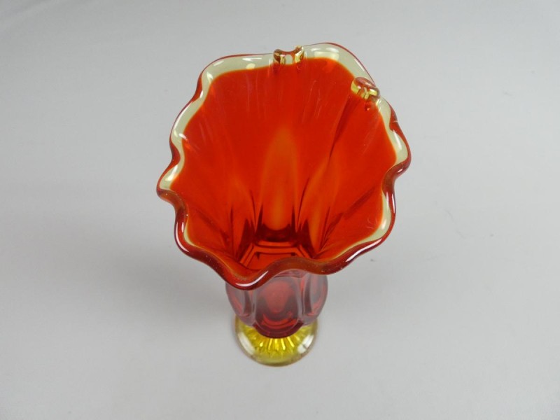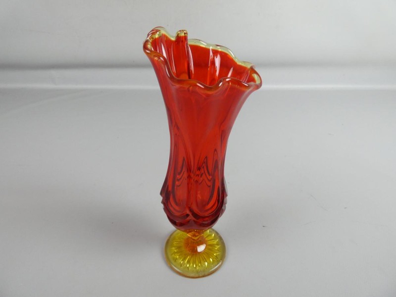 De kleurstelling en stijl doen denken aan Boheems glas of mogelijk vroeg/midden 20e-eeuws Amerikaans kunstglas. De vaas kan ook bekend staan als een "Fenton-stijl" stuk.