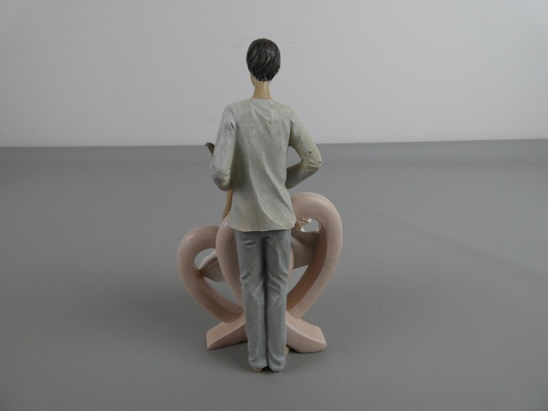 Beschrijving: Een sfeervol beeldje dat een paar in een tedere omhelzing afbeeldt, zittend op een gestileerd roze hart. De vrouw draagt een crèmekleurige jurk en houdt een boeket rozen vast. De man staat achter haar met zijn armen om haar schouders.