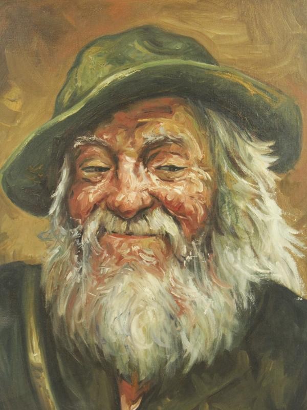 Dit expressieve portret toont een oudere man met een brede, warme glimlach, een volle witte baard en een donkergroene hoed. Het gelaat is levendig weergegeven met energieke penseelstreken die de structuur van huid, baard en haar goed laten uitkomen. De achtergrond bestaat uit losse, wervelende aardetinten die het karakter van de figuur extra diepte geven zonder van hem af te leiden.