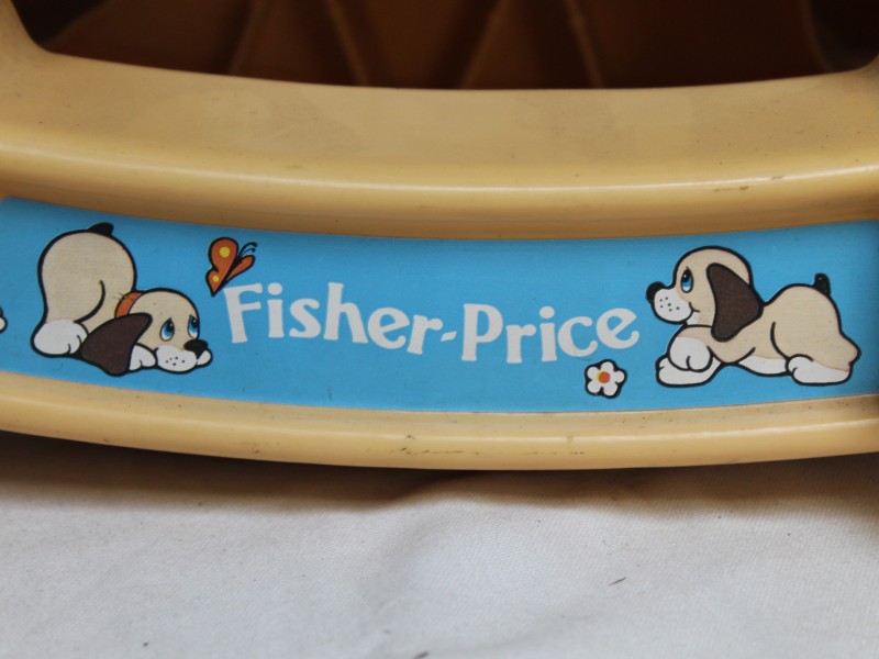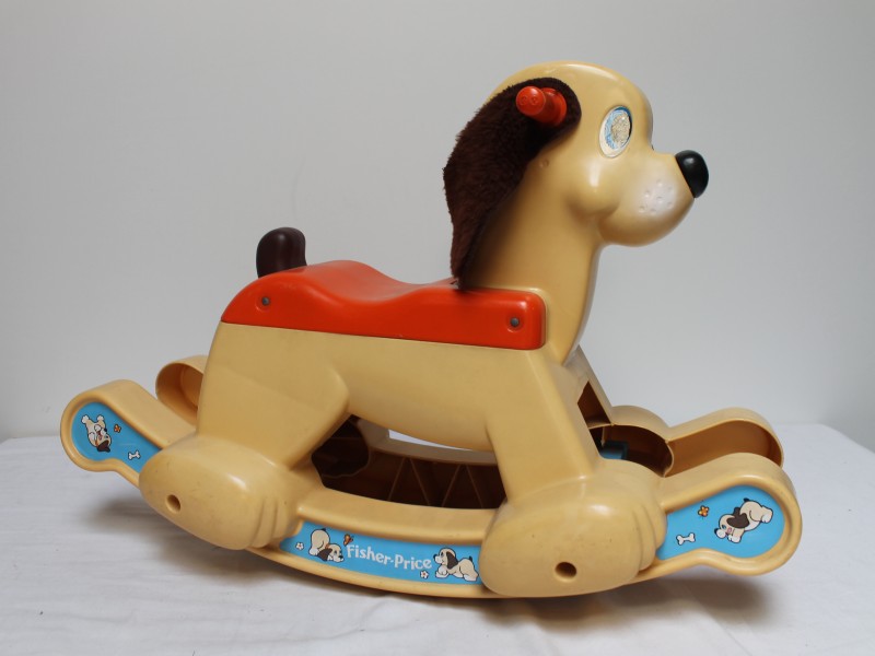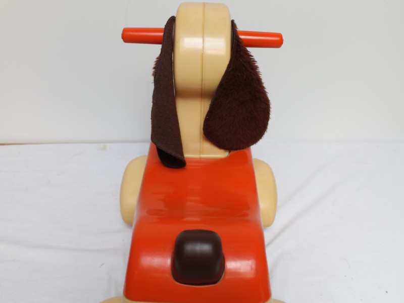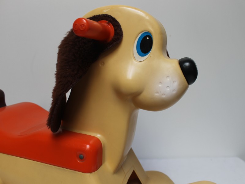 Plastieken schommelpaard in de vorm van een hond van het merk Fisher-Price voor peuters. In het hoofd zit een belletje dat rinkelt bij het schommelen.