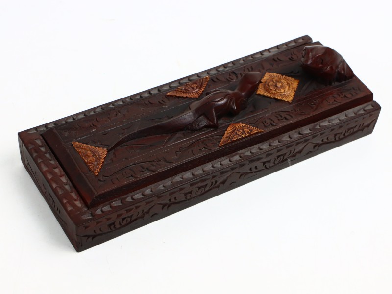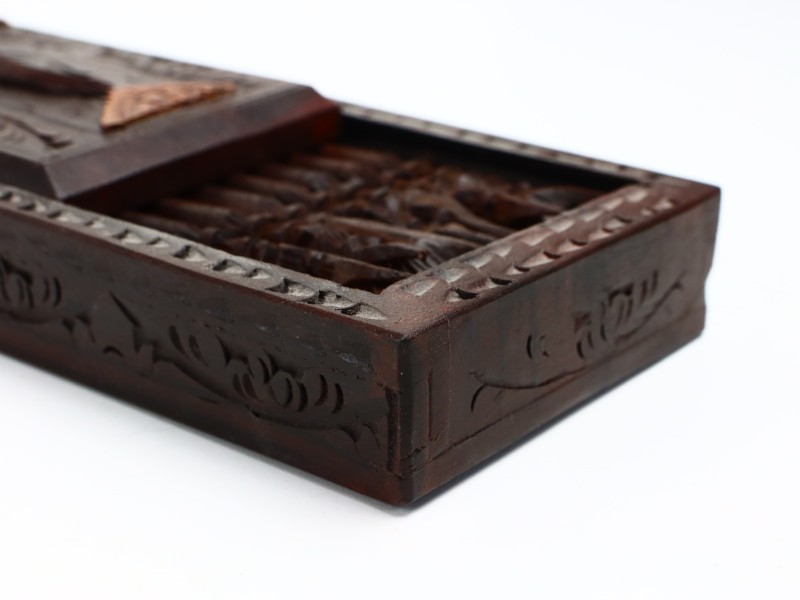 Uniek handgemaakt houten schuifdoosje met eetstokjes – verfijnd vakmanschap. Indonesië / Bali.
