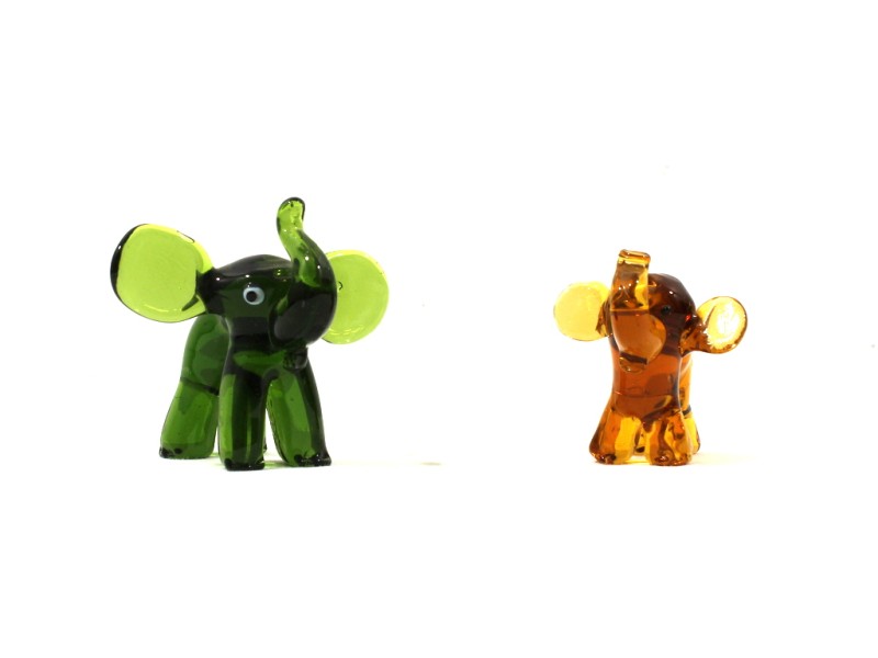 Twee kunstig vervaardigde decoratieve olifanten uit gekleurd glas.