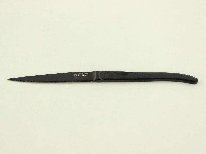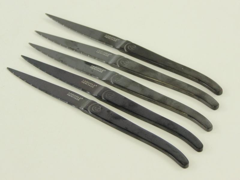 Deze set bestaat uit vijf steakmessen van het merk Laguiole Heritage, uitgevoerd in een volledig zwarte afwerking. De messen hebben een slank, licht gebogen ontwerp met fijn gekartelde lemmeten, geschikt voor het snijden van vlees en andere maaltijden aan tafel. Op de lemmeten staat de markering “Laguiole Heritage”, en op het heft is een decoratief embleem aangebracht.