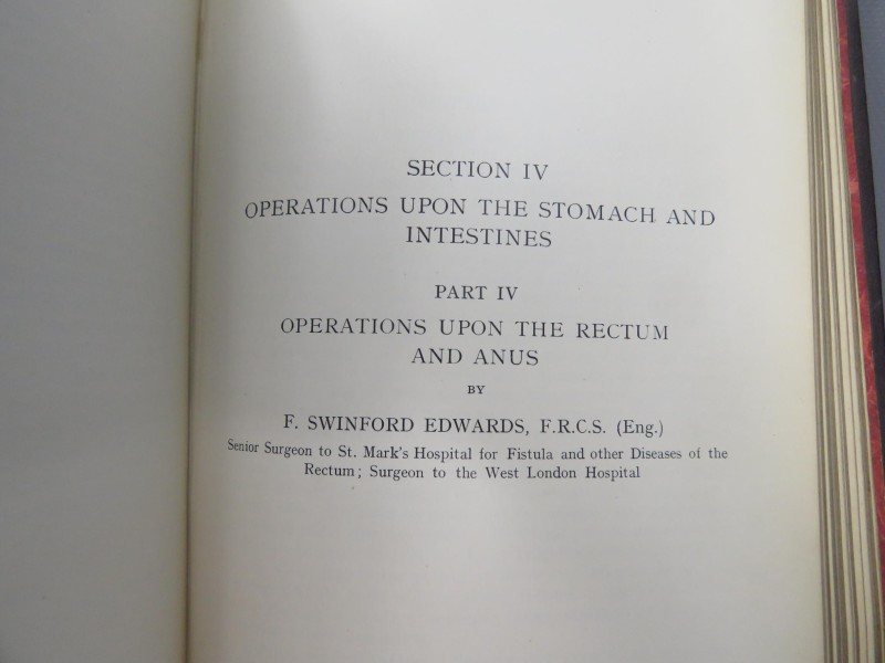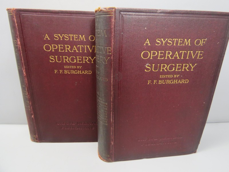 Set twee delen van antieke medische leerboeken uit het jaar 1909, getiteld "A System of Operative Surgery" - Een systeem van operatieve chirurgie - in de Engelse taal, samengesteld door verschillende auteurs onder bewerking van F.F. Burghard, M.S. (Lond.), F.R.C.S. (Eng.) docent operatieve chirurgie aan King's College, London chirurgen aan het King's College hospital, senior chirurgen aan het Kinderziekenhuis, Paddington Green. Dit werk dient als een gids voor chirurgen en behandelt chirurgische principes en het uitvoeren van operaties. Het omvat onderwerpen als het verwijderen van vreemde voorwerpen, het verlichten van ademnood en het aanpakken van slikproblemen. De tekst is gebaseerd op anatomische principes en biedt gedetailleerde instructies, vaak met illustraties. Elk boek is gebonden in donkerrood hardcover met gouden letters. Er is wat algemene slijtage, paar hoeken zijn doorgesleten (zie foto's).