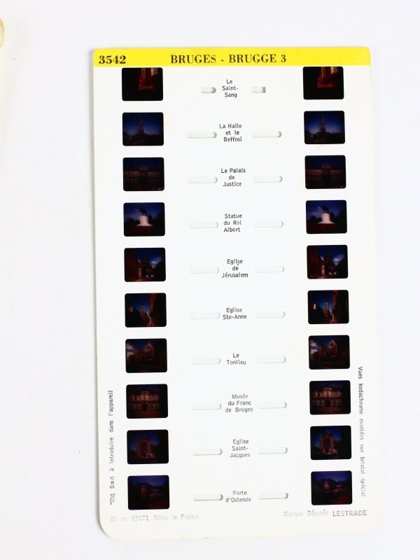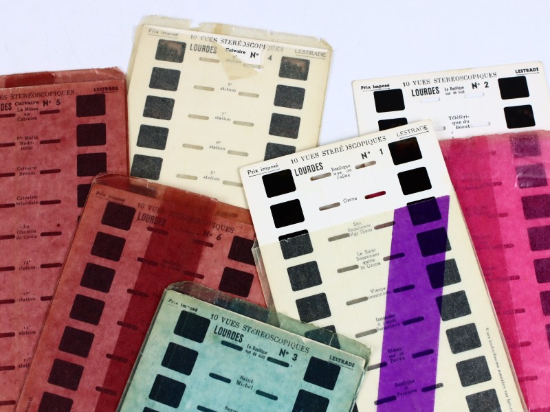 Set van rechthoekige dia’s voor Stereoscope Lestrade. Stereoscopische dia’s uit de jaren ’70, ontworpen voor gebruik met de Stereoscope Lestrade, een klassieke 3D-kijker. De dia’s tonen historische steden en religieuze locaties in levensecht 3D.