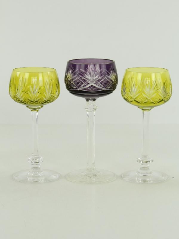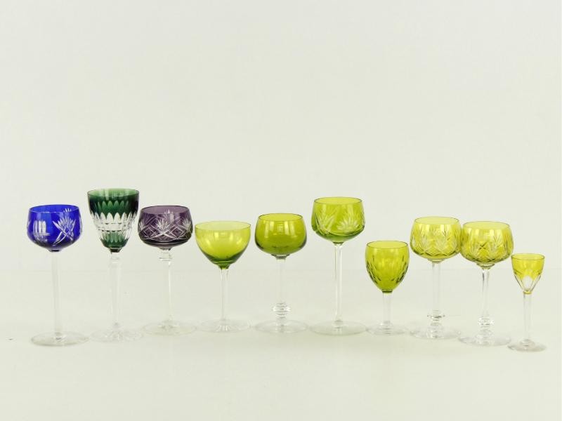 Deze set bestaat uit 10 kristallen glazen van Val Saint Lambert in verschillende vormen en maten, variërend van aperitief- tot wijnglazen. De glazen zijn uitgevoerd in diverse kleuren waaronder groen, geel, paars en blauw, en sommige zijn voorzien van geslepen decoraties zoals varens en geometrische patronen. Dit maakt de set gevarieerd en opvallend, met zowel klassieke als speelse accenten.