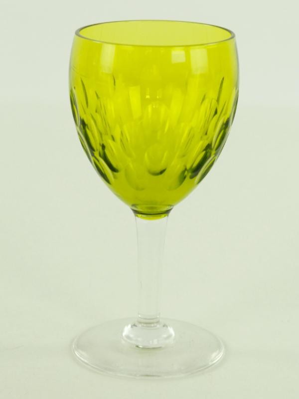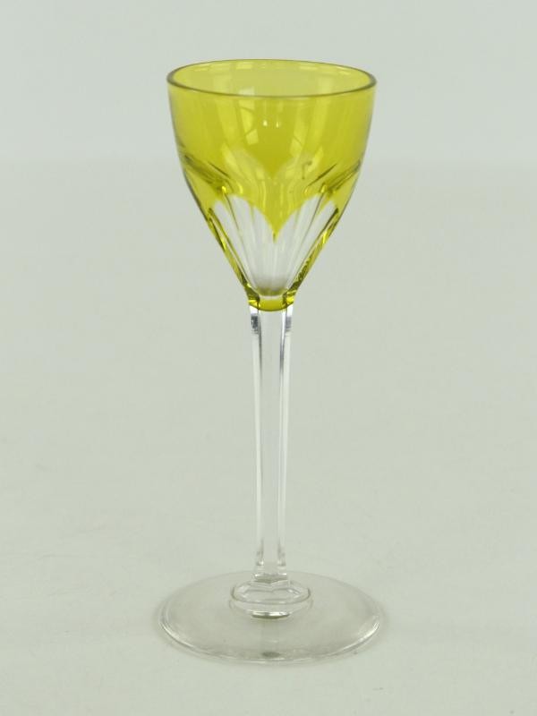Klein geel wittewijnglas: hoogte 15 cm, diameter bovenkant 7 cm, diameter voet 7 cm, diepte 7 cm, gewicht 0,14 kg
