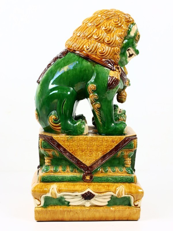 Onder de voorpoot houdt de linker leeuw een welp, symbool voor bescherming van het nageslacht en zorg voor de familie. De houding van de leeuw is dynamisch en gespierd, de manen zijn rijk gedetailleerd met levendige glazuuraccenten die de expressie van kracht en waakzaamheid versterken.