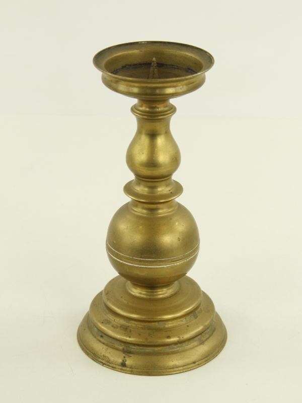 Deze symmetrische kandelaars zijn vervaardigd uit massief messing met een warme goudkleurige patina. Ze hebben een klassieke, balustervormige schacht die uitmondt in een brede, geprofileerde voet en een ronde kaarsenhouder met pin voor stevige bevestiging van de kaars. De vormgeving verwijst naar traditionele 19e-eeuwse of vroeg-20e-eeuwse modellen, waarbij eenvoud en stevigheid worden gecombineerd met een zacht glanzende afwerking. Door de tweedehandsstaat vertonen de kandelaars lichte gebruikssporen op de goudkleurige laag, wat bijdraagt aan hun authentieke vintage-uitstraling.