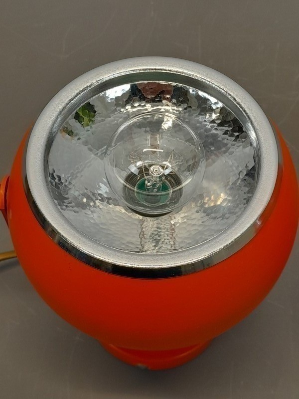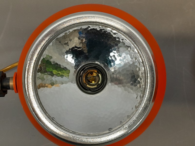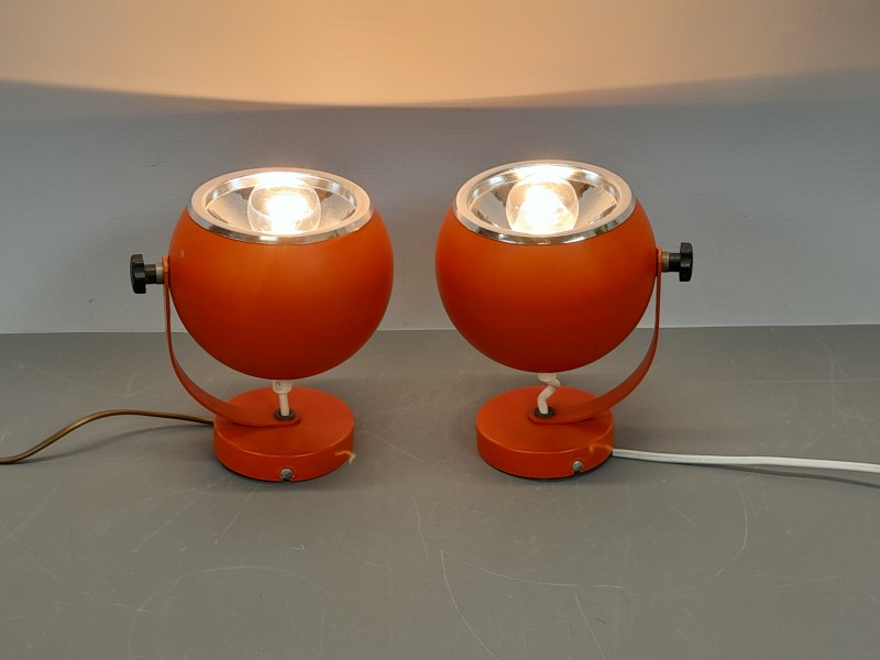 - De lampen, ook wel bekend als Eyeball lampen, zijn vervaardigd uit metaal en uitgevoerd in een opvallende oranje kleur die typisch is voor de jaren ’60 en ’70.