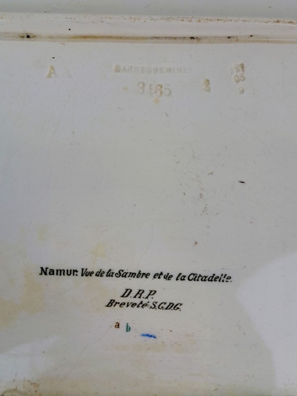De borden zijn gemaakt door Sarreguemines, een bekende Franse fabrikant van aardewerk en porselein. De naam, serienummers (3465), en merkstempels op de achterzijde bevestigen dit. Ook staat er "D.R.P. Breveté S.G.D.G." op, wat wijst op een vroeg 20e-eeuwse Franse octrooibescherming zonder garantie van de staat – gebruikelijk rond 1900–1910.De randen van de borden zijn geglazuurd in diepblauw met een goudkleurig lijntje. Het midden toont een gedetailleerde stadsgezichtprint, met lichte reliëfstructuur, handmatig ingekleurd.