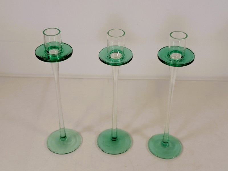 Set van 3 glazen kandelaars met groene schotel.