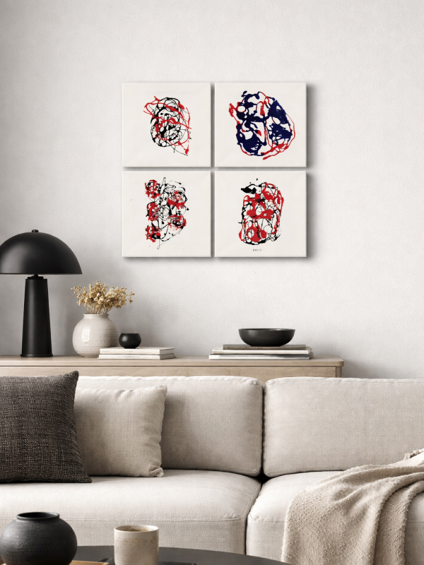 Set van vier kleine abstracte schilderwerken op canvas met een expressieve en dynamische uitstraling. Uitgevoerd in druip- en giettechniek (mogelijks lakverf) met een hoogglanzend effect. De composities bestaan uit energieke lijnen, lussen en verfspatten in zwart, rood en bij één werk ook donkerblauw, sterk contrasterend tegen een witte achtergrond. De verf is plaatselijk dikker aangebracht, wat zorgt voor een licht reliëf en extra diepte. Elk paneel heeft een eigen ritme, maar vormt samen een harmonieus geheel. Opgespannen op houten spielatten en achteraan eenvoudig afgewerkt. In de stijl van action painting / abstract expressionisme (à la Jackson Pollock). Niet gesigneerd. Leuke, decoratieve set om een muur speels en modern aan te vullen.