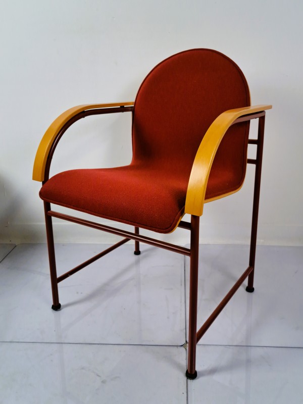 Deze set bestaat uit vier opvallende designstoelen, waarschijnlijk uit de jaren 80 of 90. De stoelen hebben een bijzondere vorm met een ovale rugleuning en elegant gebogen houten armleuningen. Het frame is gemaakt van rood metalen buizen, wat zorgt voor een luchtige en moderne uitstraling. De zitting en rug zijn bekleed met warm bordeauxrode stof. De achterkant van de rugleuning is afgewerkt met gebogen fineer in een lichte houtkleur. Deze stoelen passen goed in een retro interieur, maar ook in een modern kantoor of wachtkamer.