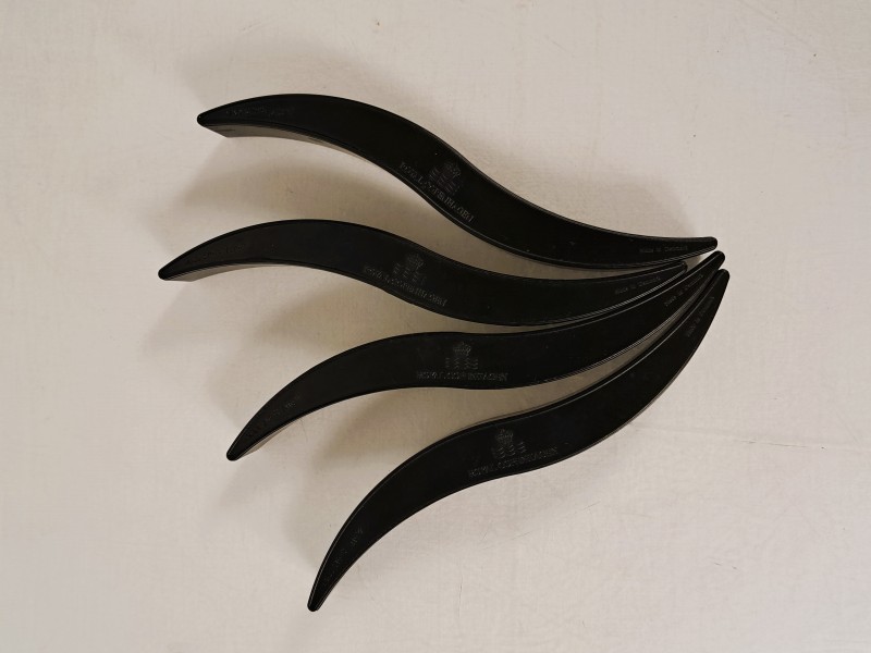 Deze set bestaat uit vier zwarte ovensteunen van Royal Copenhagen. De steunen zijn gemaakt van hittebestendig kunststof. Op elk stuk staat het logo met de kroon en de naam Royal Copenhagen. Aan de zijkant staat vermeld: Max 210°C / 410°F. Dit is de maximale temperatuur die de steunen kunnen verdragen. De ovensteunen hebben een gebogen vorm. Ze zijn ontworpen om rond een warme ovenschaal te plaatsen. Zo beschermen ze je tafel tegen hitte. Ze zorgen ook voor een betere grip bij het verplaatsen van een warme schaal. Dit type accessoire werd vooral gemaakt in de jaren 1960 tot 1980. In die periode maakte Royal Copenhagen veel oven- en serveeronderdelen. Ze hoorden vaak bij ovenschaal sets. Royal Copenhagen is een bekend Deens merk. Het merk staat bekend om zijn kwaliteit en vakmanschap. Deze set is een praktisch en stijlvol keukenaccessoire.