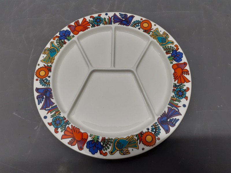 Complete vintage Villeroy & Boch Acapulco oesterset bestaande uit 6 oesterborden en een bijpassende ovale serveerschaal. Deze set is geproduceerd in Luxemburg en uitgevoerd in het geliefde Acapulco-decor, geïnspireerd op Mexicaanse volkskunst met levendige kleuren en speelse motieven. Gemaakt van hoogwaardig vitró-porselein en zeer geschikt als decoratief verzamelobject of voor stijlvol serveren. Mooie, complete set uit de jaren 60/70.