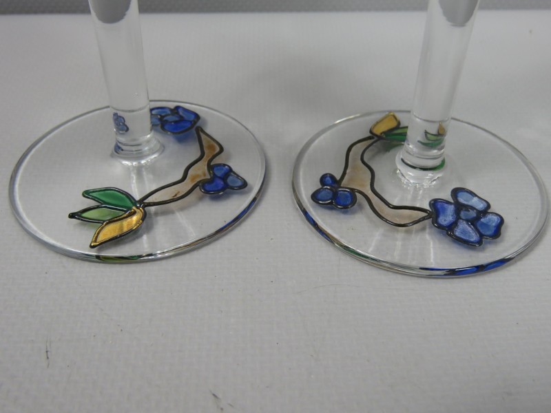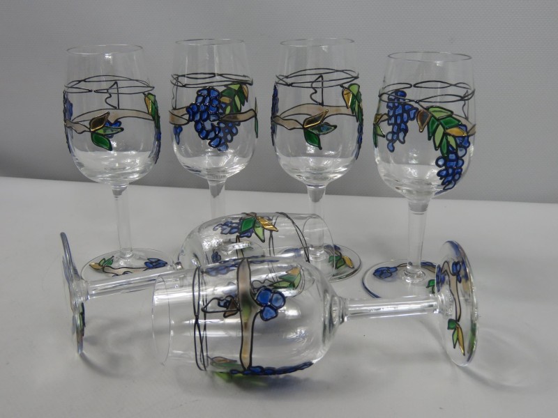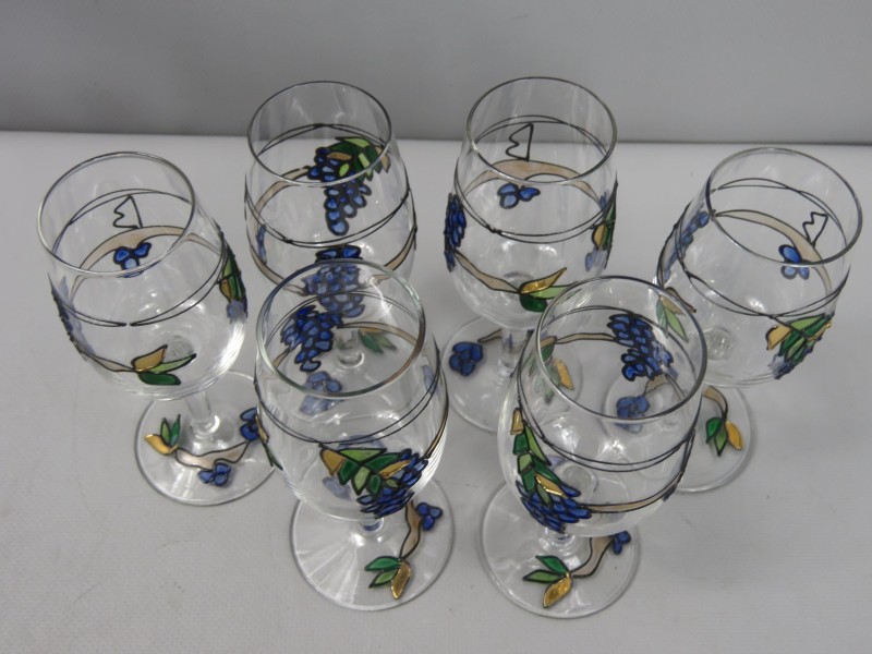Deze set bestaat uit 6 x handgeschilderde vintage wijnglazen uit de 'Tiffany' serie van ontwerper Paul Nagel.