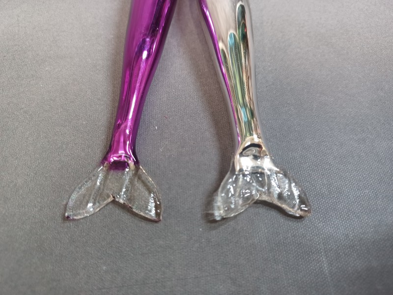 - Glazen vinnen en staart: De staart en/of vinnen zijn apart gevormd en gedecoreerd met een transparante of gesatineerde glitterspray.
