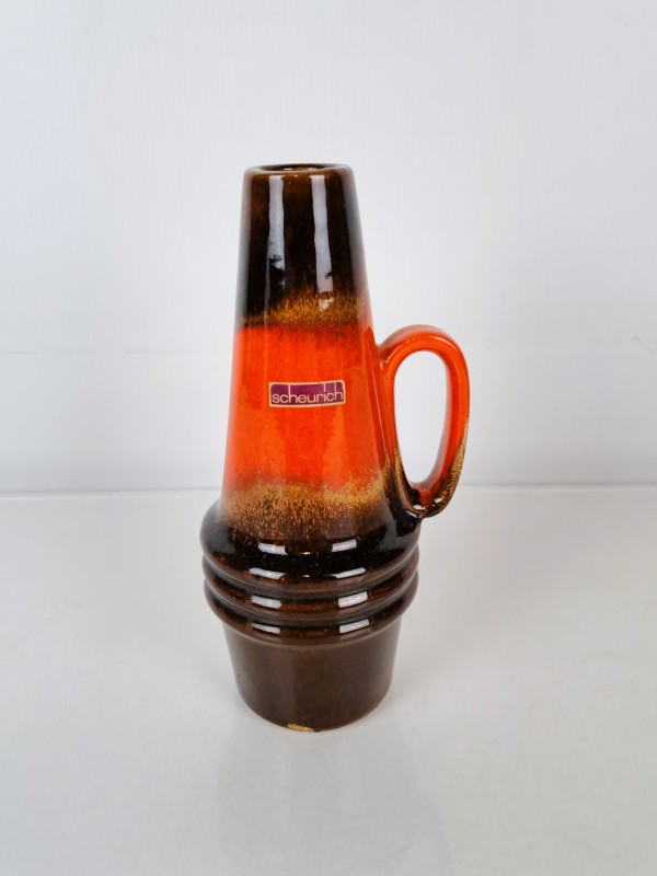 Deze set bestaat uit twee vintage keramieken vazen, beide gemaakt in West-Duitsland in de jaren 60 of 70. De eerste vaas is van het merk Scheurich, gemerkt met modelnummer 400-22. Het is een karakteristieke "fat lava" vaas met glanzende bruine en felrode glazuurlaag.