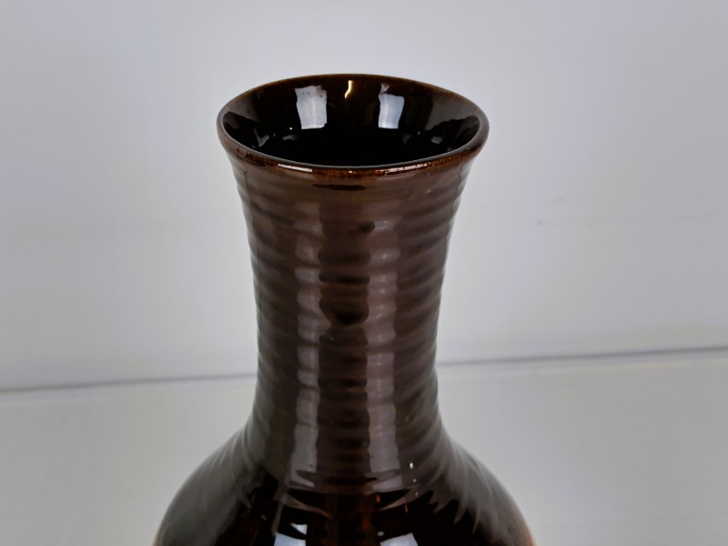 De glazuur is overlopend van donkerbruin naar beige, met een lichte craqueléstructuur.