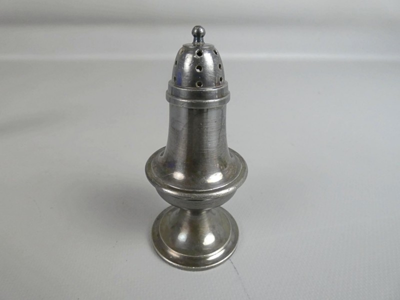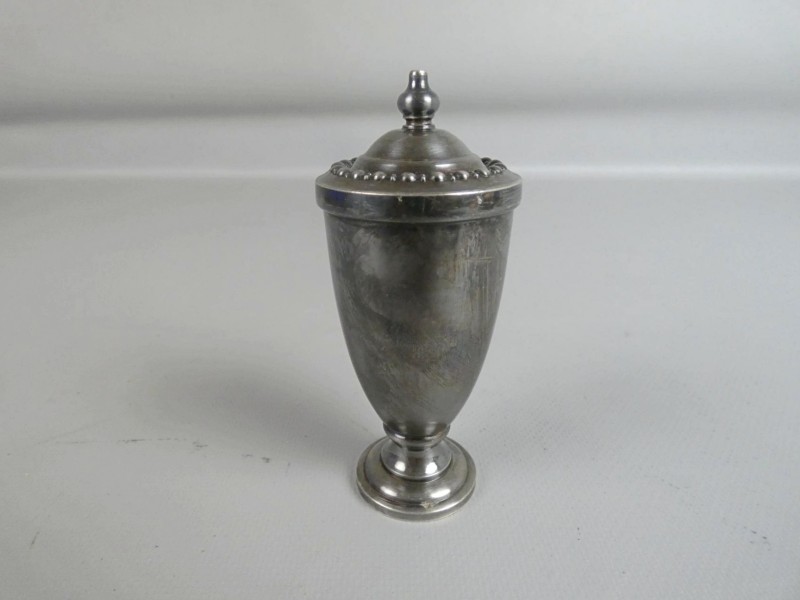 De kelkvormige strooier heeft een deksel met kraaldecoratie (parelrand) en een decoratieve knop.