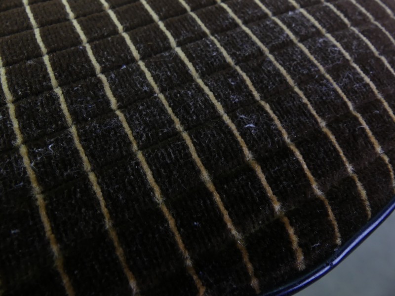 Vintage krukken met chroomkleurige metalen poten en ronde zitting in bruin fluweel met subtiel rasterpatroon. Stevig en stijlvol, ideaal voor keuken, atelier of een retro interieur.