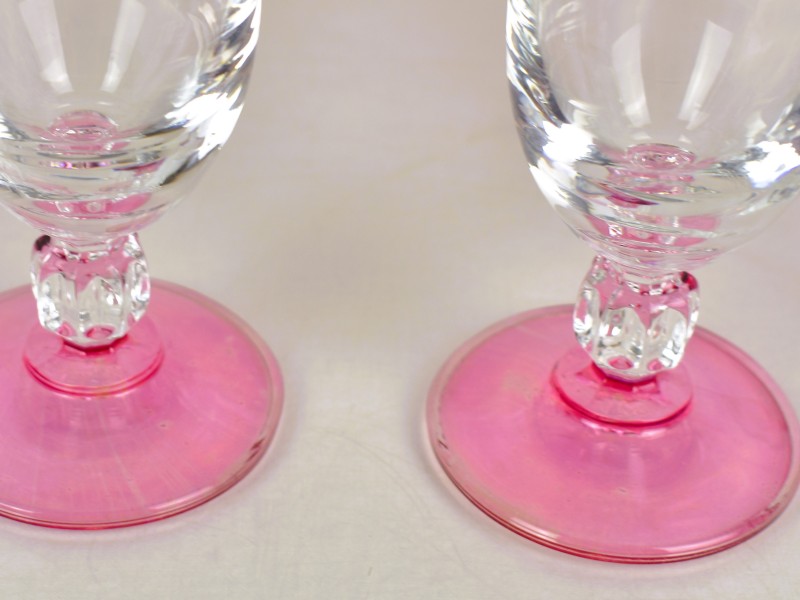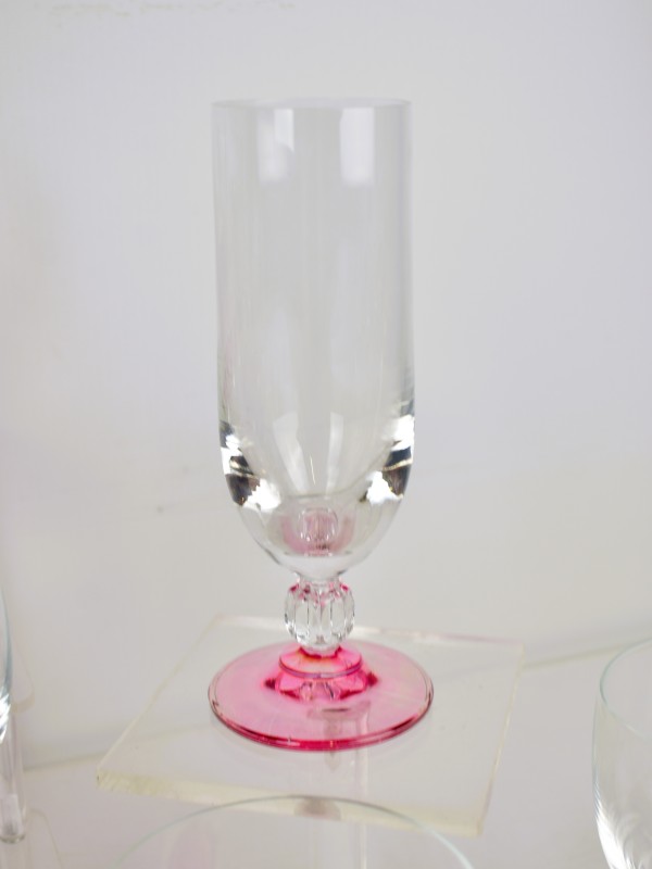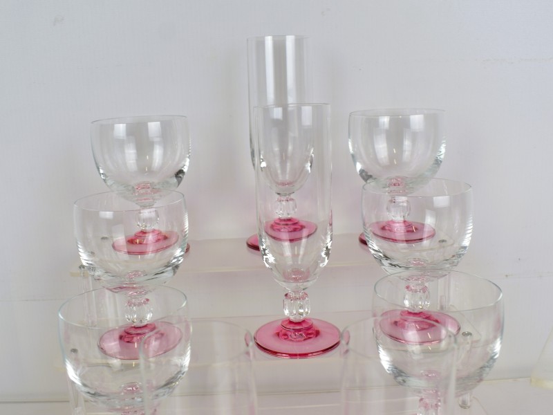Deze set bestaat uit verschillende drinkglazen met roze voetjes. De kelken zijn helder en elegant gevormd. De roze voet en steel geven een retro uitstraling. Dit soort glazen was populair in Europa in de jaren 70 en 80. Waarschijnlijk zijn ze gemaakt door merken zoals Luminarc of Arcoroc uit Frankrijk. Het ontwerp is typisch voor feestelijke gelegenheden en past goed in een vintage interieur.
