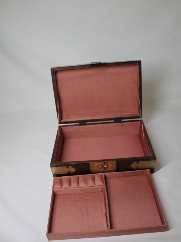 Deze antieke Victoriaanse sieradendoos is gemaakt van notenhout en heeft een koperen beslag met een Oriëntaals thema. Het kistje is gewatteerd en bevat een uitneembare lade. De onderzijde heeft gebruiksporen.