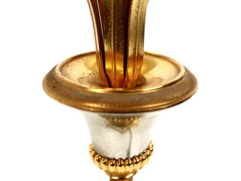 De voet van de lamp is klassiek opgebouwd uit verschillende lagen en materialen. Een kelkvormig middenstuk met glanzend verchroomd metaal wordt omlijst door vergulde details met fijne reliëfversieringen. De lamp staat stevig op een vierkante, gelaagde sokkel, waarbij goud- en zilvertinten elkaar harmonieus afwisselen. De onderkant van de voet is voorzien van een groen viltje.