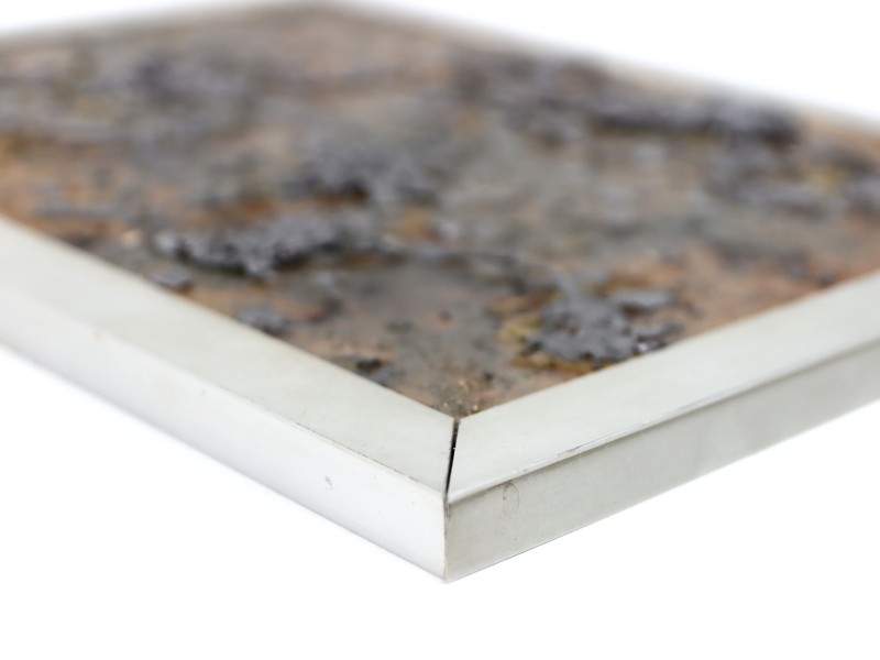 Dit is een ingelijst in aluminium kader, een abstract 'schilderij met metalen verf' dat de schoonheid van natuurlijk verval of corrosie nabootst. Gemaakt op een plankje.