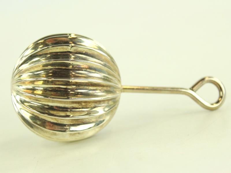 Deze Sphera wijnfilter is vervaardigd uit verzilverd metaal en wordt aangeboden in de originele verpakking. Het object heeft een bolvormig ontwerp met verticale ribbelstructuur en een rechte steel die eindigt in een lusvormig handvat. De glanzende, reflecterende afwerking vertoont lichte gebruikssporen die overeenkomen met de tweedehandsstaat.