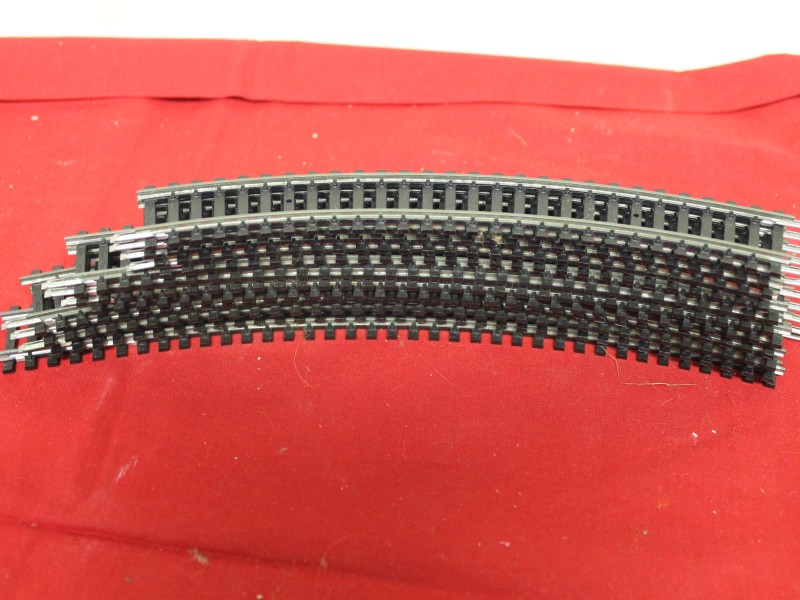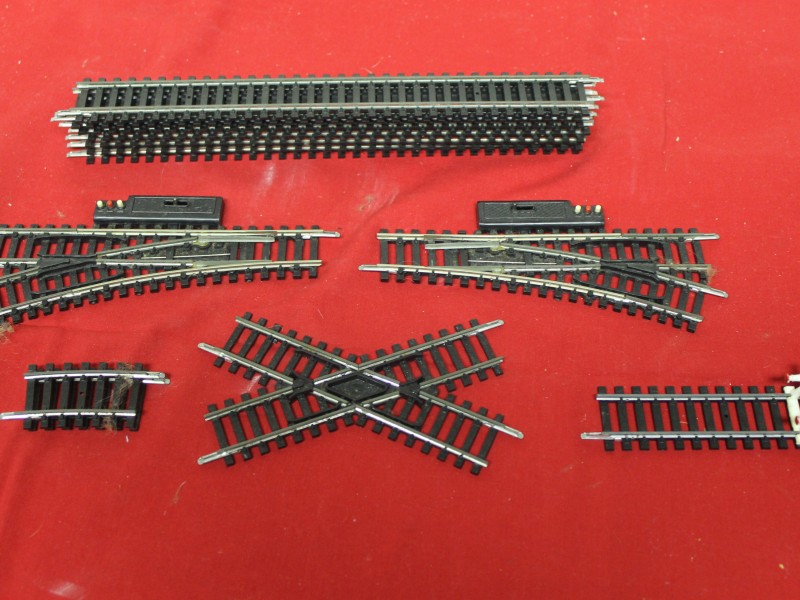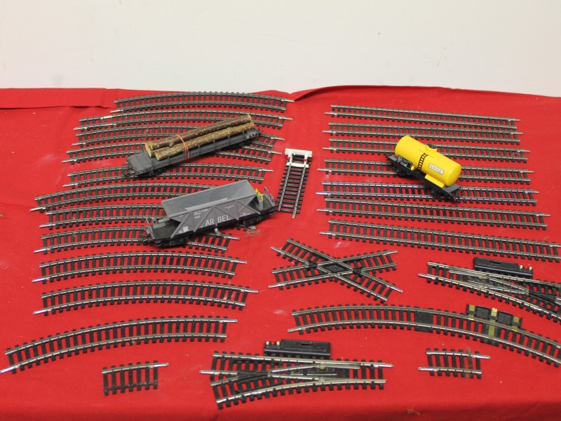 Sporen- en wagonset 'Jouef' bestaande uit een 12-tal gebogen rails (verschillende lengtes), 7 rechte rails (zelfde lengte), 2 korte rechte rails, een stootblok, een spoorwegkruising, 2 wisselrails en 3 goederenwagons.