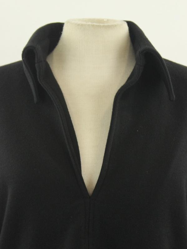 Zeer stijlvolle zwarte winterjurk van het Italiaanse modehuis Sportmax, bekend om zijn moderne snit, hoogwaardige materialen en minimalistische elegantie. De jurk heeft een rechte, elegante pasvorm met een overhemdkraag en een diepe V-hals van 22 cm. Aan de mouwen (62 cm lang) zitten twee knopen per pols als verfijnd detail. De jurk sluit met een zijrits van 24 cm en is uitgevoerd in een comfortabele, warme stofmix – ideaal voor herfst en winter.