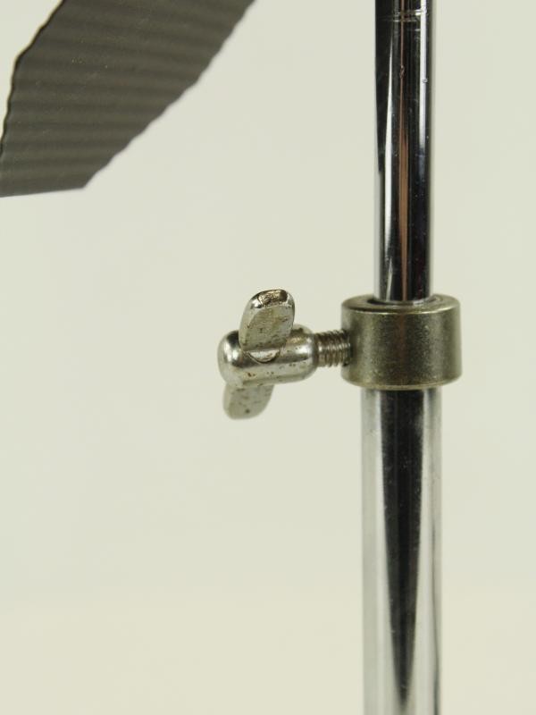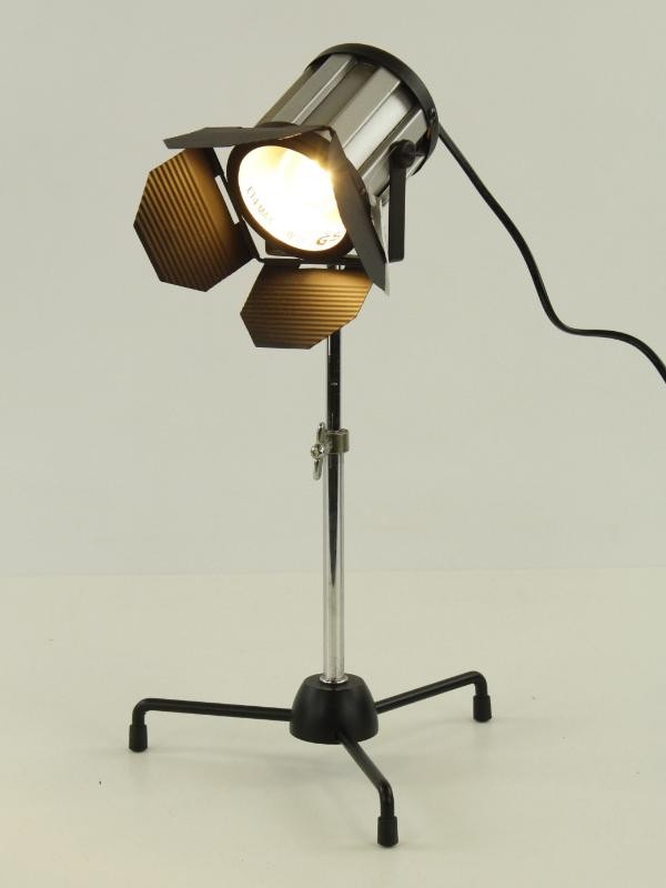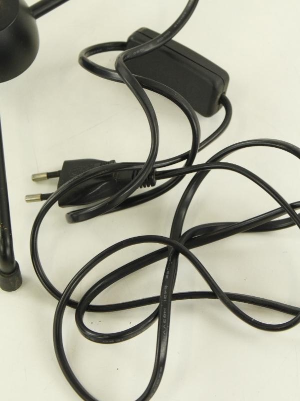 De armatuur toont tekenen van normaal gebruik (lichte krassen op kleppen, kabelletsel licht) maar functioneert technisch naar behoren. De zwart/chroom-kleurstelling en verstelmechaniek suggereren gebruik voor fotostudio, werkplaats of decorlicht in plaats van puur huishoudelijk gebruik.